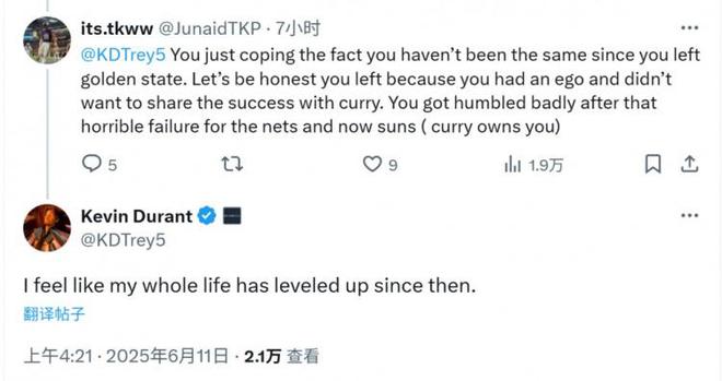 直播吧6月11日讯 今天,杜兰特在社媒和网友互动。