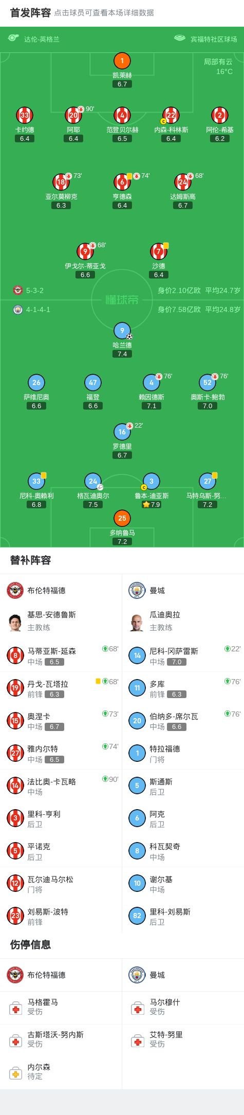 剑南春|曼城1-0客胜布伦特福德,哈兰德制胜,罗德里伤退