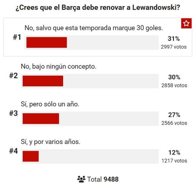 莱万与巴萨合同明夏到期,《马卡》报就巴萨是否应该与之续约发起网络调查,共9488名球迷参与投票,有30%认为无论如何都不续约—— ①不,除非他本赛季打进30球 31% ②不,任何情况下都不 30% ③是,但只续一年 27% ④是,续约好几年 12% 本季迄今,莱万为巴萨出场9次打入4球,其中4次首发,共出场431分钟。据西媒报道,莱万首选留在巴萨,至少留在欧洲,暂不考虑前往沙特、美国。而如果莱万离队,巴萨希望免签弗拉霍维奇,而马竞、米兰、尤文有意免签莱万。